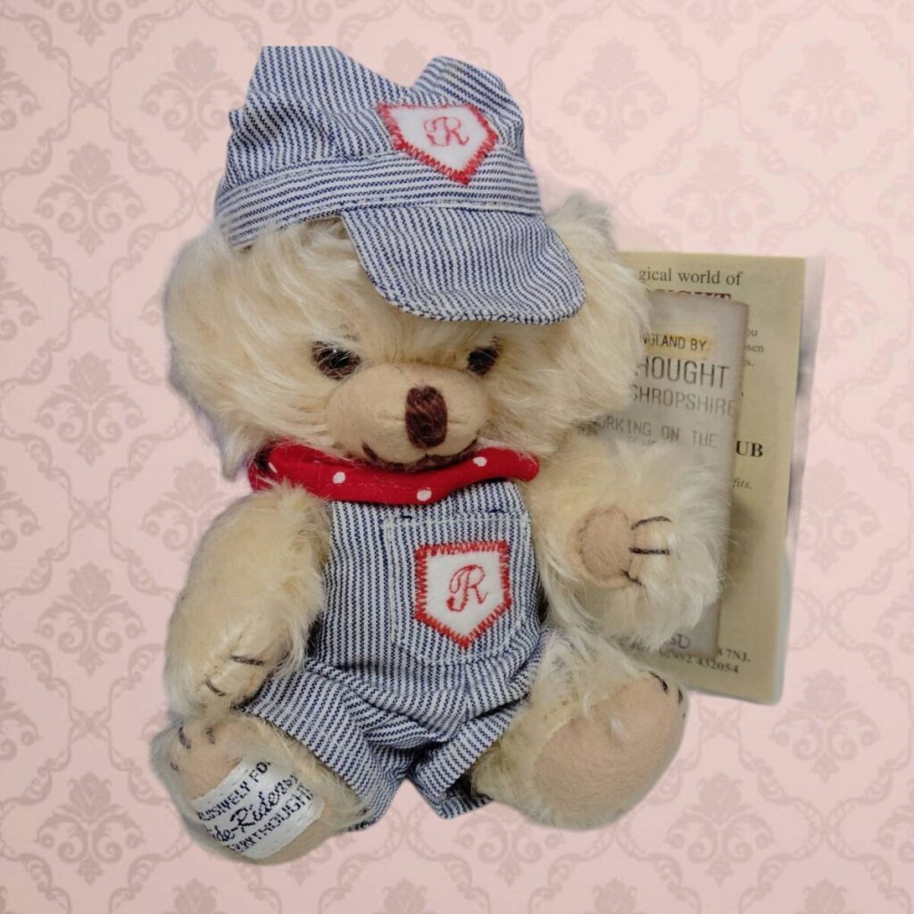 チーキーはメリーソートを代表する人気シリーズで、愛らしい表情とハンドメイドの温かみが特徴です。本モデルは「Working On The Railroad」のテーマを持つアメリカ限定仕様で、コレクション性のあるテディベアとして扱われることがあります。